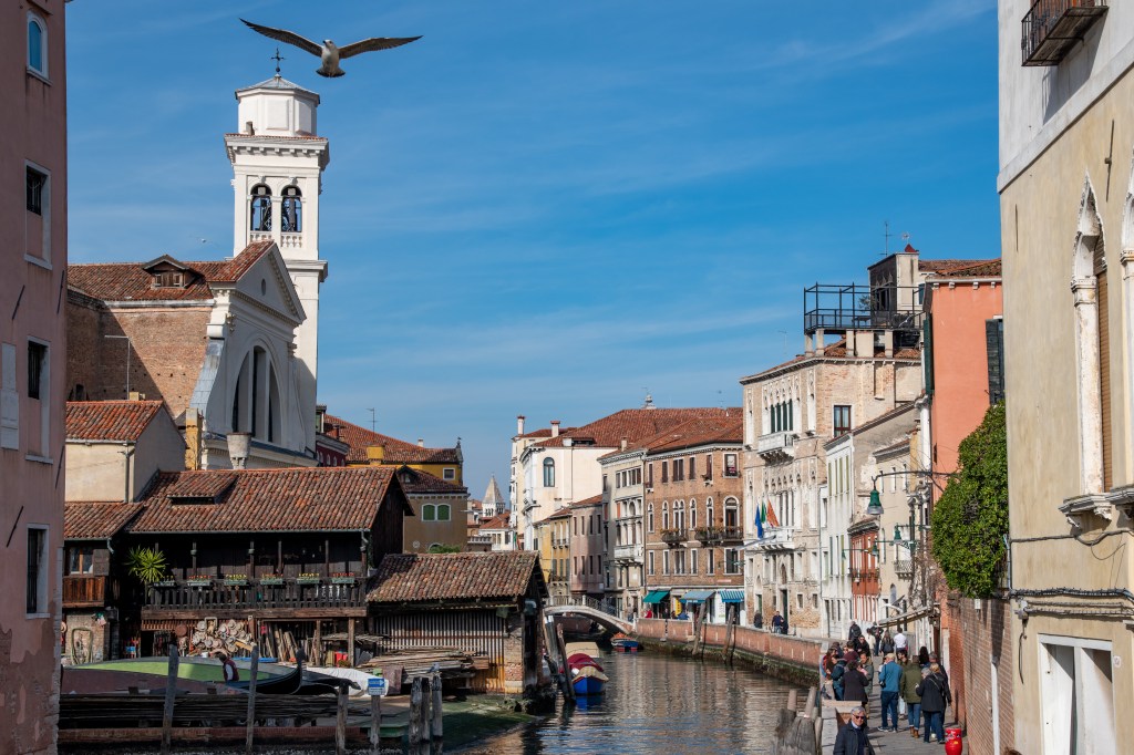 Freitag, den 17.3.2023. Die Fähre nach Griechenland ist gebucht. Wir haben einen Tag für Venedig und lassen uns durch die Gassen treiben. Direkt neben unserem Campingplatz Fusina geht stündlich eine kleine Fähre in die Stadt. 20 Minuten Fahrzeit! Wir passieren kleine und kleinste Inseln (insgesamt gibt es 121!), fahren an einer kleinen Löfflerkolonie vorbei.