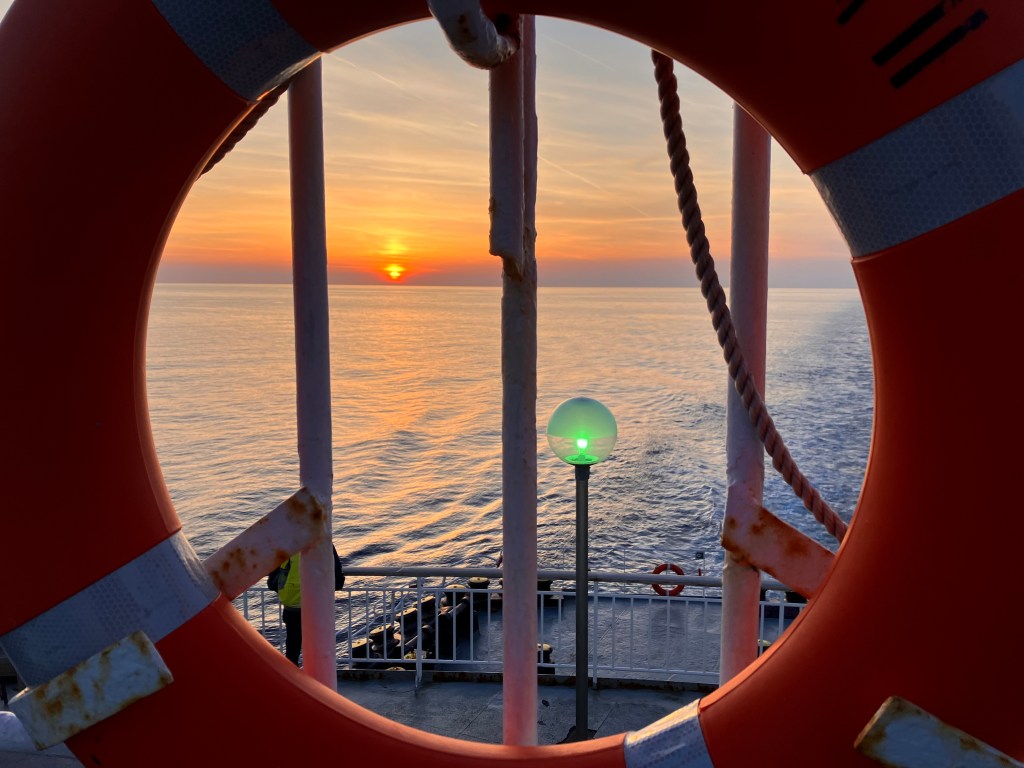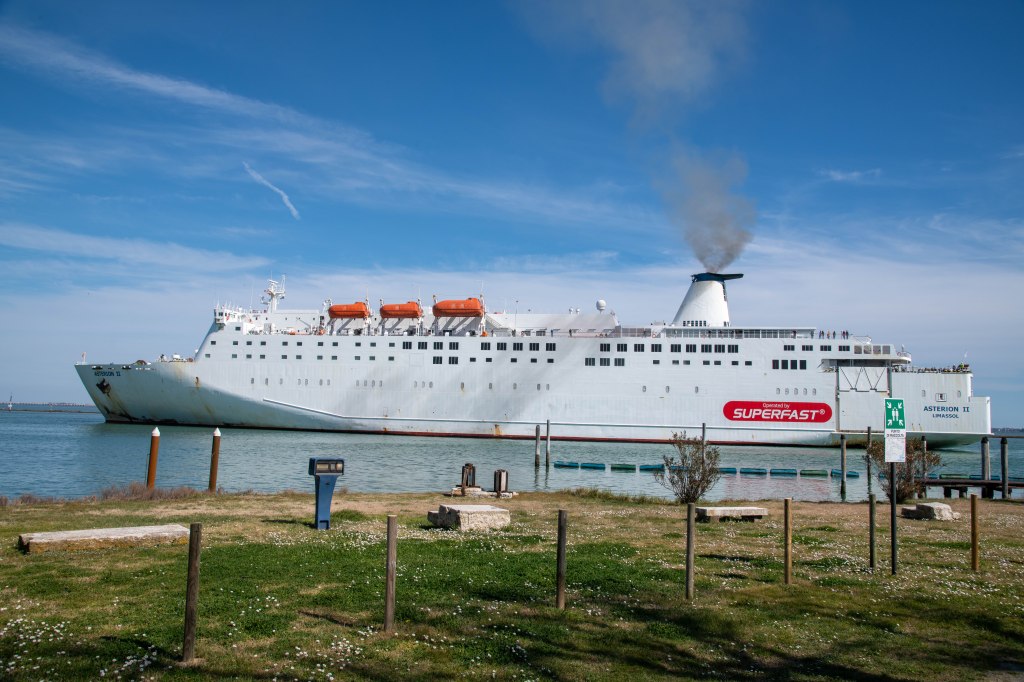 18.-20.03.2023. Wir verlassen abends die Lagune von Venedig mit einer alten Fähre, der Asterion II, sie ist beim Einlaufen in den Hafen direkt an unseren Campingplatz vorbeigefahren….man beachte die dunkle Abgasfahne!