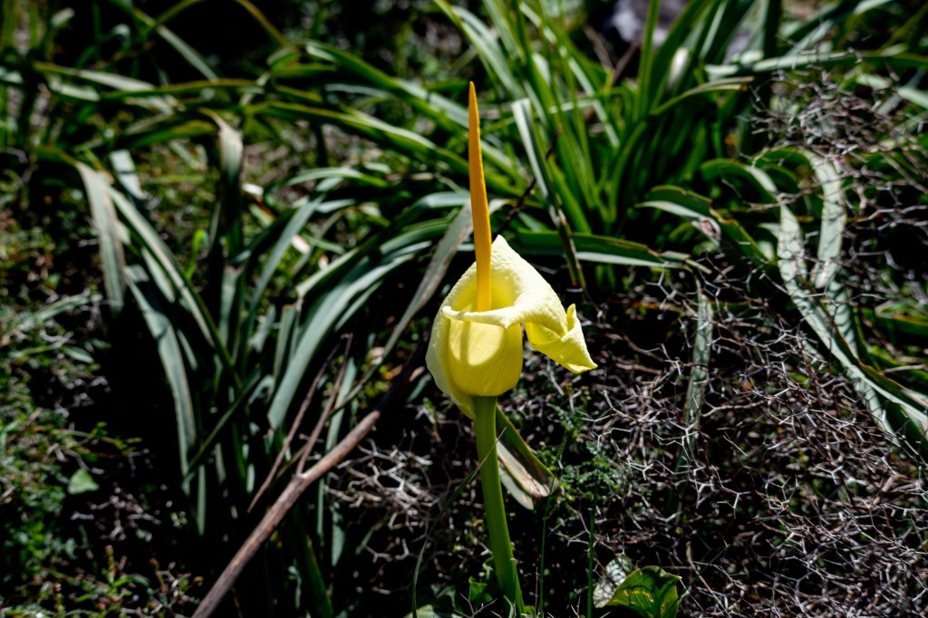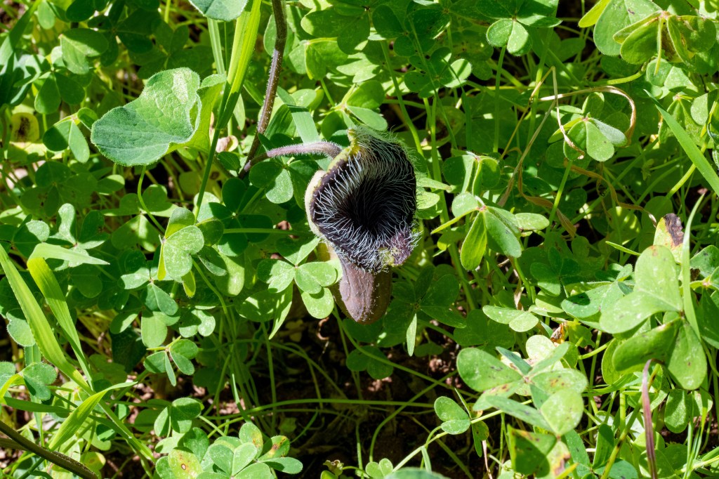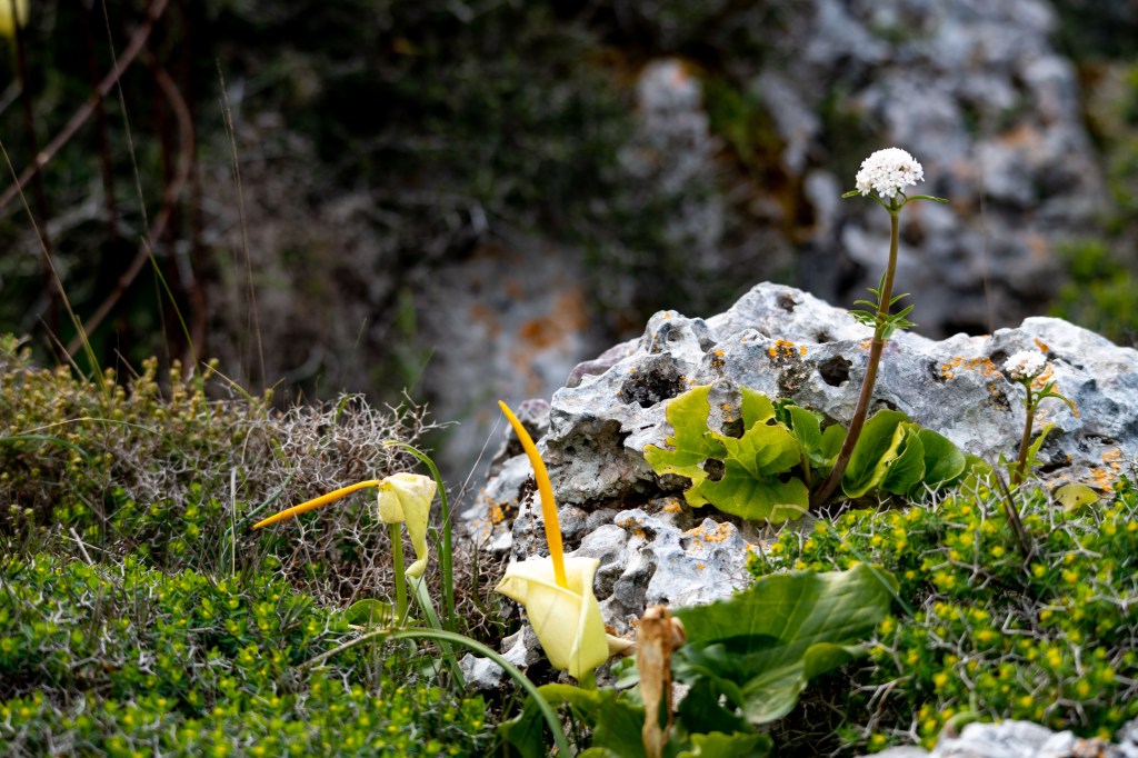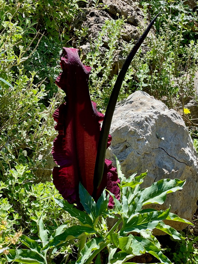 Die Pflanzenwelt Kretas fasziniert. Die oben abgebildete kretische Osterluzei bildet bis zu 18 cm lange Röhren in Form eines Saxophons. Sie sind eine Insektenfalle, in die – durch fauligen Geruch angelockt, kleine Insekten bis zum Grund der Röhre zu den eigentlichen Blüten hineinkriechen; die abwärts gerichteten weissen Haare sorgen dafür, dass sie nicht mehr so schnell wieder herauskommen … bis die Staubbeutel gereift sind und sie mit Pollen beladen sind … neben der kretischen Osterluzei im Tal der Toten haben wir an anderer Stelle ( auf über 1000 m ) den kretischen Aronstab entdeckt … die giftige Pflanze (bereits Berührungen können Hautrötungen und -blasen verursachen) arbeitet mit dem gleichen Prinzip einer Fliegenkesselfalle.