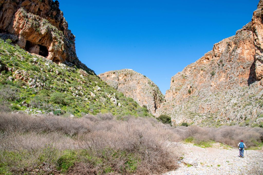Ende März. Wir erkunden Ostkreta, u.a. gelangen wir auf abenteuerlichen Wegen (weil das Garmin-Auto-Navi uns im Stich gelassen hat) in die Bucht von Kato Zakros. Dort stand einer der vier bisher gefundenen Palaststädte der alten Minoer. Schon im 3. Jahrtausend v. Chr. haben sie ihre Toten in hoch in den Felsen gelegenen Höhlen bestattet, dieses „Tal der Toten“ ist für uns eine herrliche Schluchten-„Kletterung“ (Kletterung meint nach Bettina die Mischung aus Wanderung und Kletterei). Wie auch für andere Schluchten auf Kreta wird in Führern für das Frühjahr auch hier darauf hingewiesen, dass Flussdurchquerungen nötig werden. Brav nehmen wir auch jedes Mal wasserfeste Sandalen mit in den Rucksack. Bisher haben wir sie nie gebraucht…. das Flussbett ist zumeist ausgetrocknet oder nur noch so minimal mit Wasser gefüllt, so dass wir regelmäßig über Steine hüpfend, alles mühelos überwinden können … die Wanderstöcke von Bettina sind dabei eine große Hilfe … Klimawandelfolgen auf Kreta?