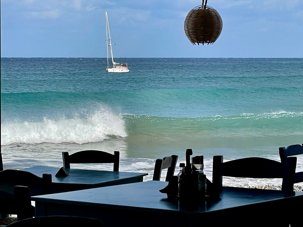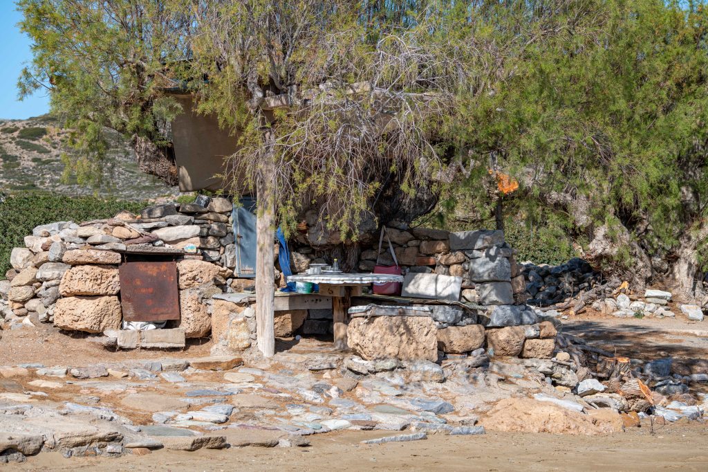 In der Bucht hat eine der wenigen Tavernen bereits in der Vorsaison geöffnet und wir können – gegen Besuch der Taverne – auf einer dazugehörigen Wiese übernachten und nachts das Bad benutzen …