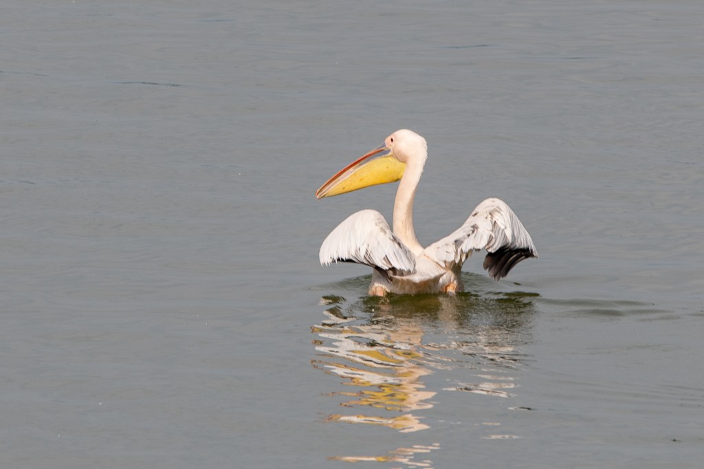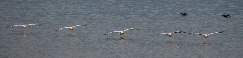 Es gibt in Europa nur zwei Arten von Pelikanen, den Rosapelikan (Spannweite bis 295 cm) und den noch etwas größeren Krauskopfpelikan (Spannweite bis 320 cm!). Beide Arten sind auf dem See vertreten.